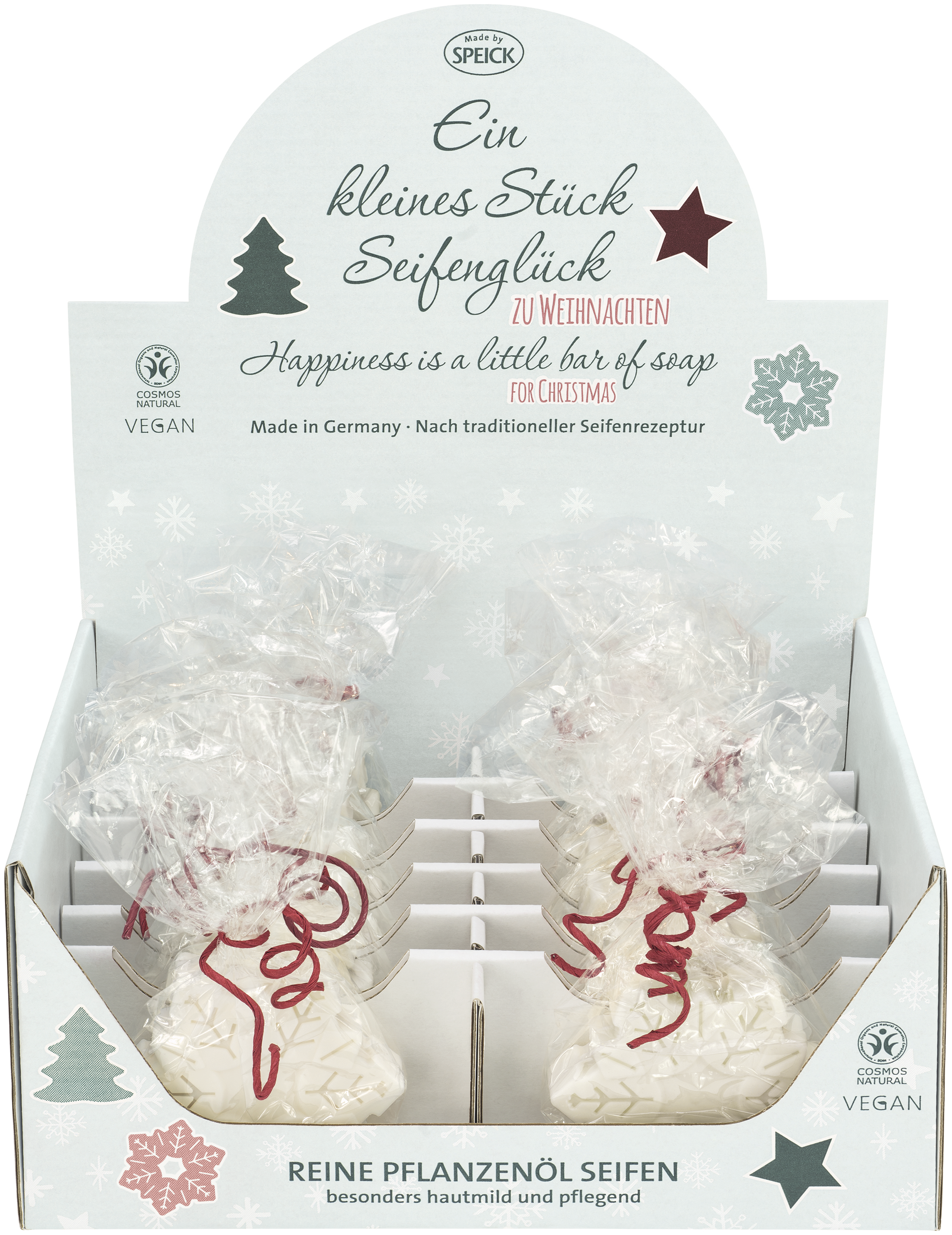 Einzeln verpackt in Zellophan-Tüten. 12 Stück im offenen Display. Bei den Tüten handelt es sich um Holzzellulose. Die Zellulose-Verpackung schützt die Seife vor Macken und Verduftung und gewährleistet, dass jedes Stück Seife genauso duftend und frisch bei unseren VerbraucherInnen ankommt, wie es auch unser Haus verlässt. Display für optimales Recycling im Altpapier, Tüten in der gelben Tonne entsorgen.