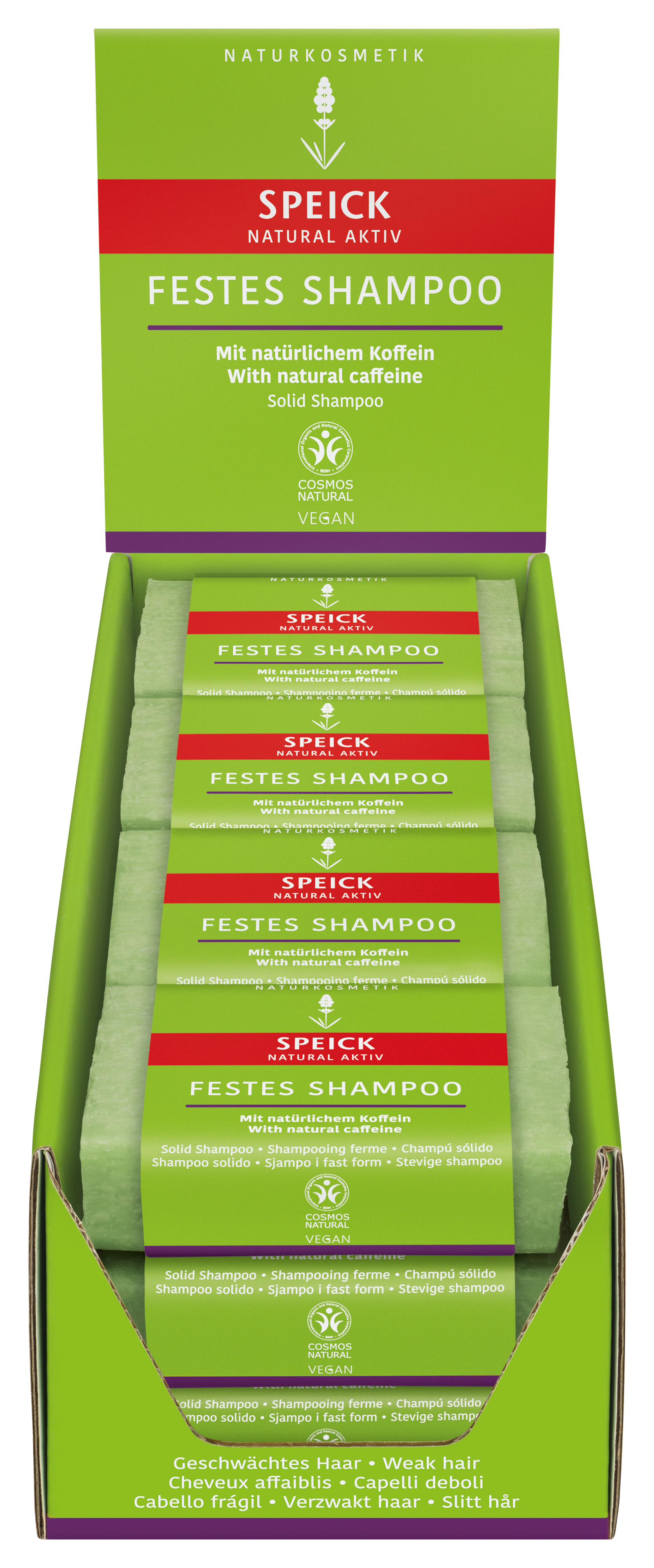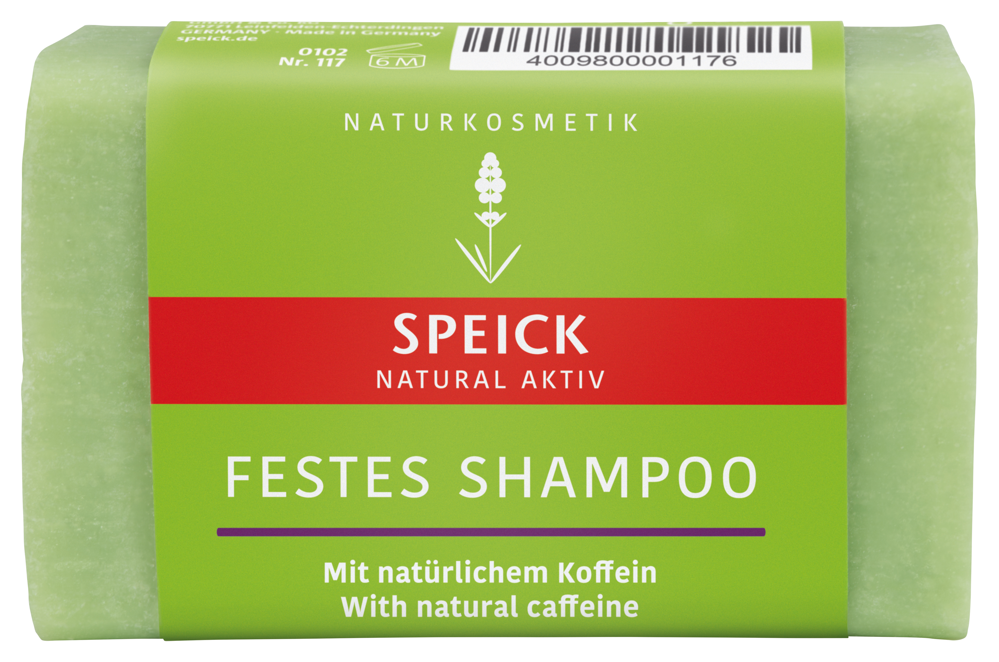 Waschrohstoff, Enthärtetes Wasser, Zitronensäure, Arganöl (kbA), Sheabutter (kbA), Coffein, Hydrolysiertes Weizenprotein mit konditionierenden Eigenschaften, Wachscreme (pflanzliche Basis), Emulgator, Konditionierer, Aloe Vera Gel, Speick-Pflanzenextrakt (Pflanze aus kontrolliert biologischer Wildsammlung), Komposition ätherischer Öle, Bestandteil ätherisches Öl, Mineralpigment