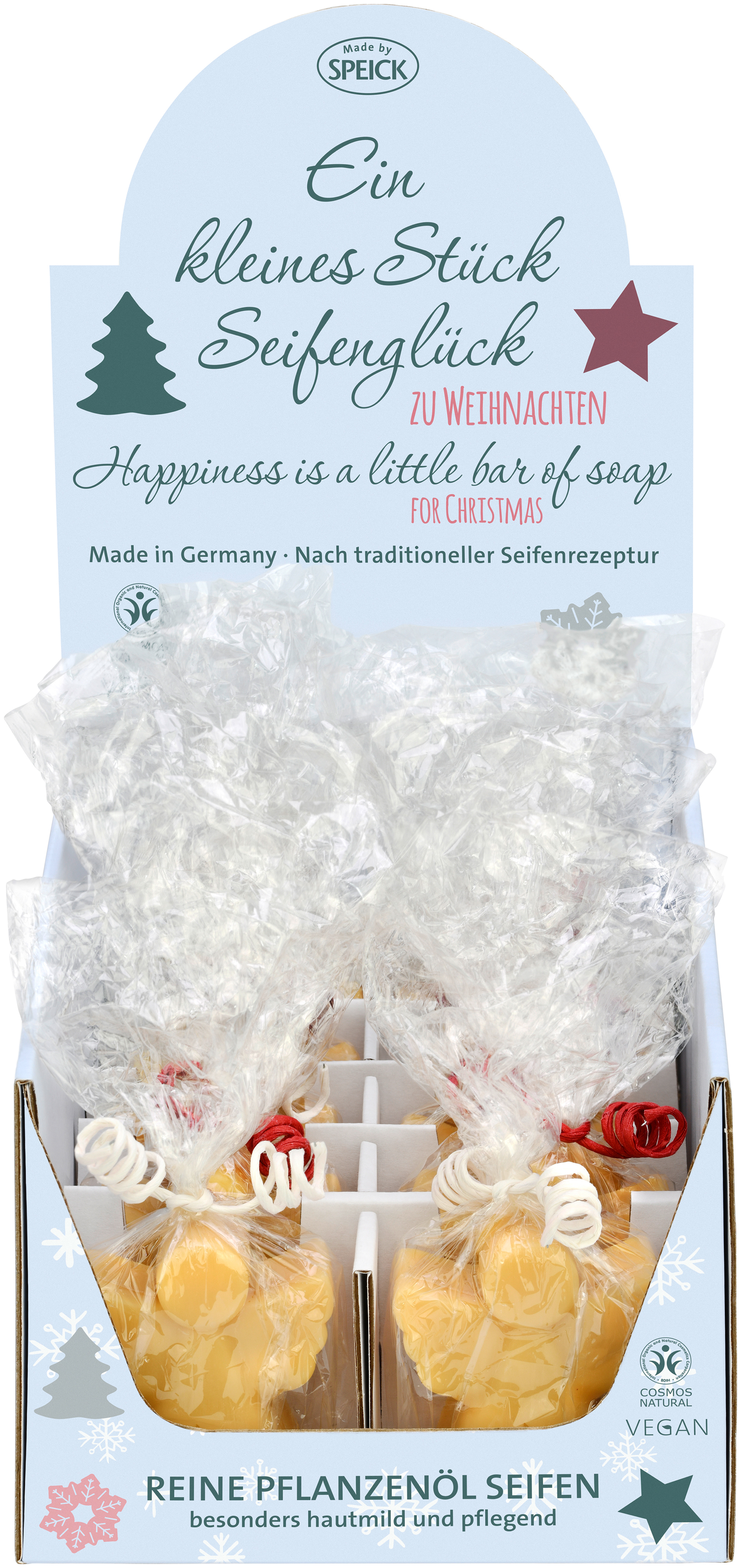 Individually packed in cellophane bags. 12 units per display. The bags are made from wood cellulose. The cellulose packaging protects our soaps from blemishes and from losing their fragrance and ensures that every soap bar arrives in our customer's homes with the quality and freshness as it leaves our factory. For optimal recycling, dispose of cellulose film in recycling bin. Dispose of paper display in waste paper bin.